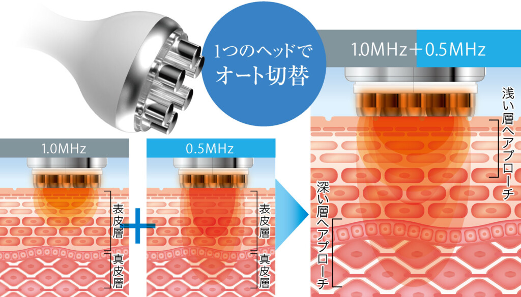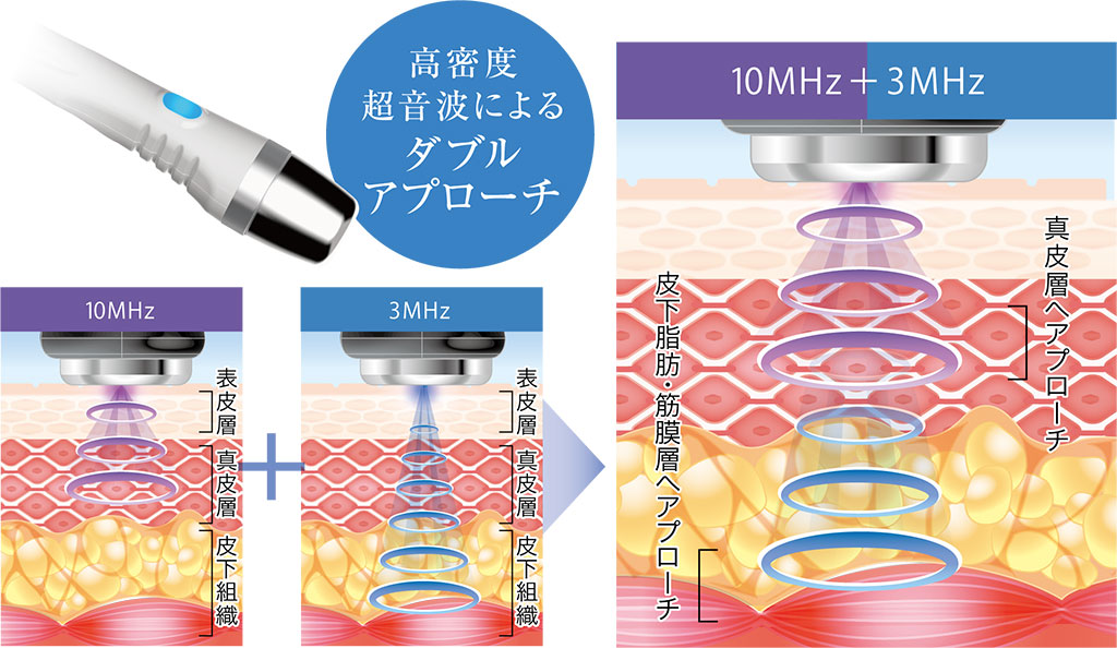 10MHzと3MHzの高密度超音波によるダブルアプローチを実現。10MHzでは、細胞膜の厚さよりも細かい幅の振動を与えることで有用成分の浸透度をアップし肌環境をサポート。3MHzではマイクロトリートメントにより温熱作用でさらなる浸透促進を叶え、角層深部から潤いあふれる肌へと導きます。